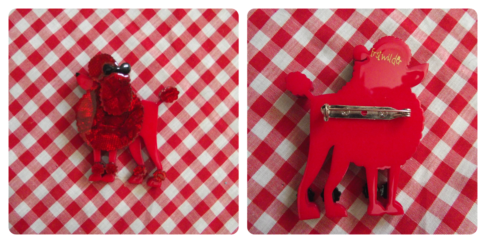 I went a bit nuts with the colour red in my photos below, but I think the red gingham works well with this lovely lady! And of course, I had to do a poodle hairstyle to match with my brooch!
